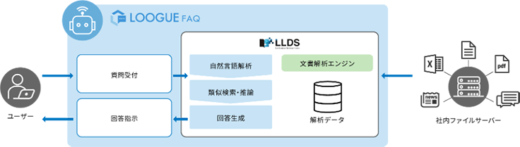 お客様がすでにお持ちの社内ガイドラインや手続きマニュアル等のドキュメントをそのままLOOGUE FAQで読み込むことによりFAQデータを自動生成します。聞き返しやインテリジェントカテゴライザーなど既存のLOOGUE FAQ機能特徴と併せて利用も可能となります。