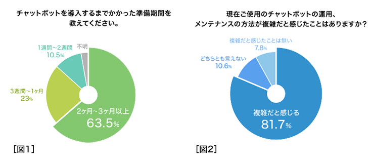 また、「チャットボットの運用、メンテナンス方法が複雑だと感じますか」という質問に対しては8割以上(81.7%)の方が複雑だと感じており、チャットボットは導入時だけではなく導入後にも作業時間や工数などの多くの負担が導入企業に見られ、チャットボット管理者はメンテナンス業務の負担による「チャットボット疲れ」が生じている事が分かります。[図2]