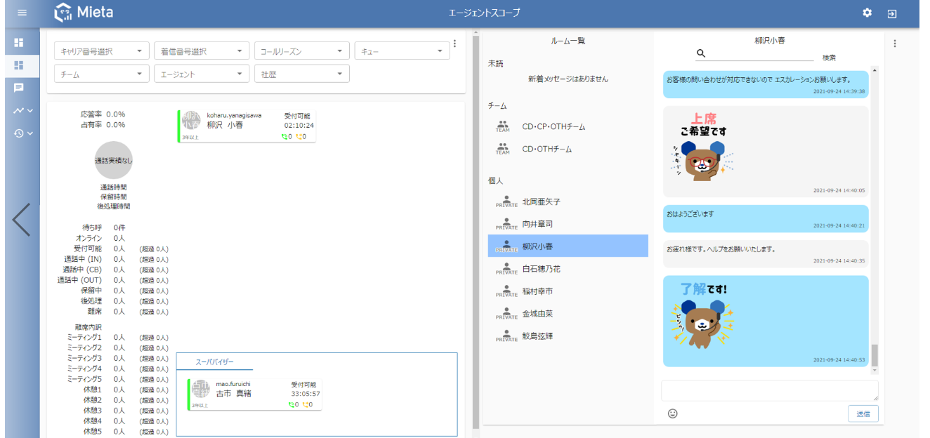 既にMieta導入のお客様からも同じツール内で、SVから在宅オペレータへのアラート通知や在宅オペレータからSVへのエスカレーションでの「手上げ」をチャットで通知したり、「スタンプ」によるコミュニケーションを図りたいとのご要望をいただいており、今回そのご要望を機能として実現いたしました。