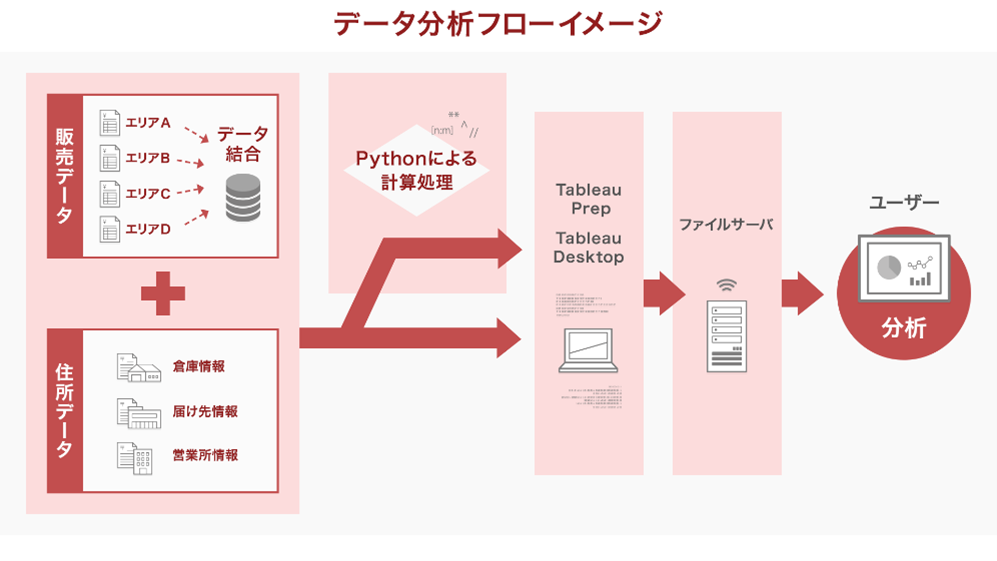 2022年10月より、datarisチームが支援を開始。都道府県ごとのデータを結合しマスタ作成を行うなどの事前準備を行い、システムへデータを連携したのち、配送走行距離、配送回数、緯度経度のデータを抽出。その後エリアごとにTableauでのダッシュボードを構築することで、配送コストの可視化と分析ができる環境をつくりました。