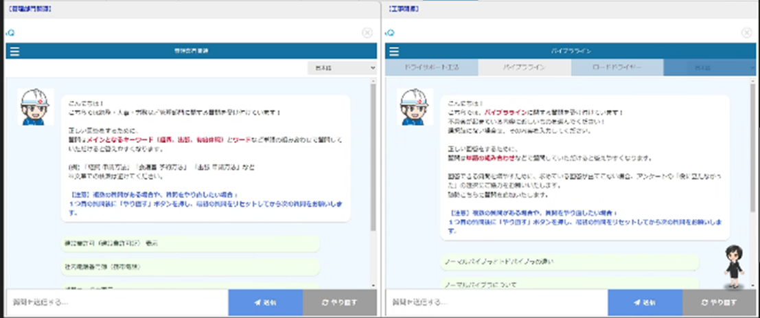 一方で工事は深夜や早朝も動いており、現場の社員にとっては本社や関連部署が稼働していない時間帯には問い合わせをしても回答が得られません。こういった業務の円滑化を目的に、問い合わせに対して即時に自動応答できるチャットボットサービスの導入を検討することになりました。