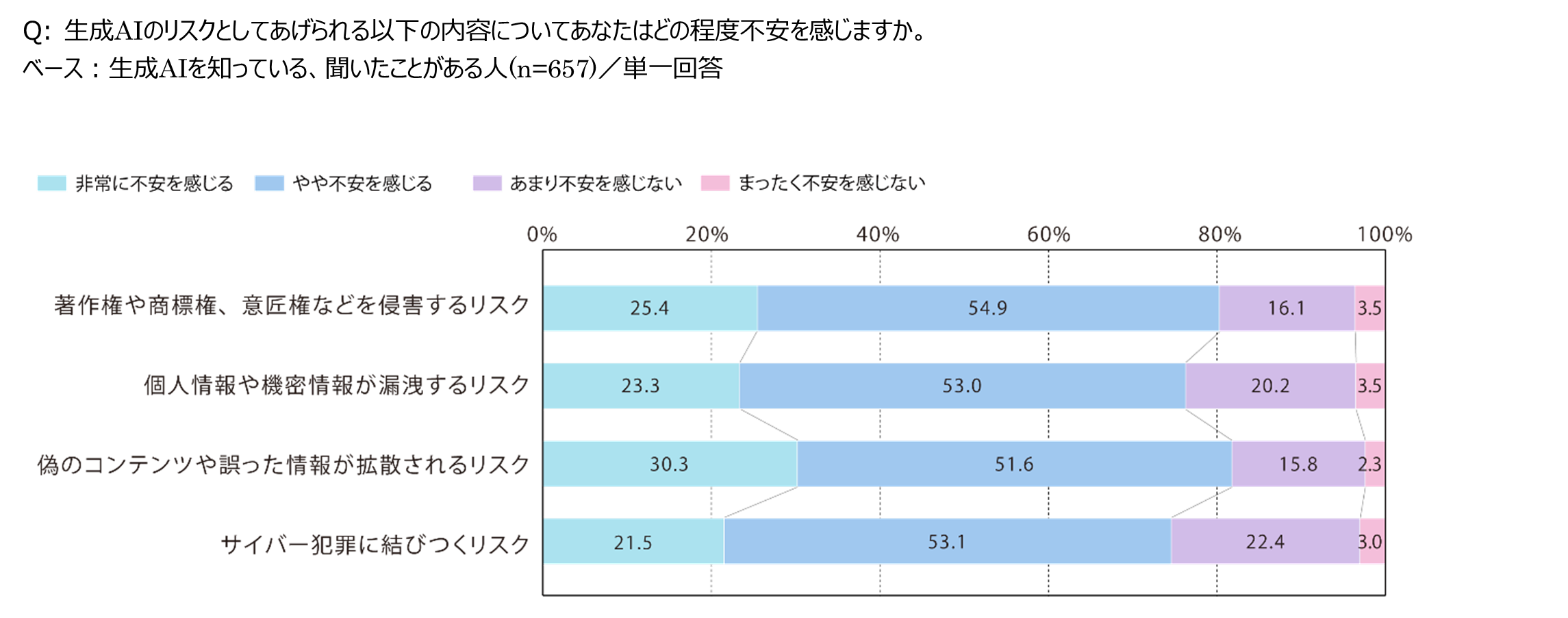 生成AIのリスクについて、それぞれどの程度不安を感じるか尋ねました。「非常に不安を感じる」という回答が最多だったのは「偽のコンテンツや誤った情報が拡散されるリスク」で30.3%。「非常に不安を感じる」「やや不安を感じる」の合計も81.9%と最も高い状況でした。