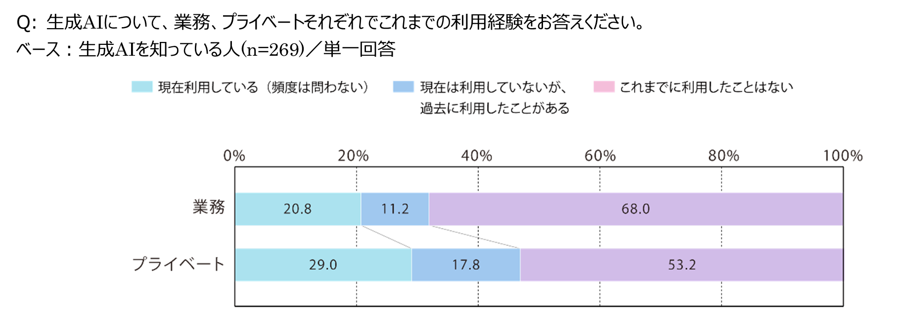 業務、プライベートでの利用状況をそれぞれ尋ねたところ、業務で「現在利用している」は20.8%、「現在は利用していないが、過去に利用したことがある」は11.2%でした。