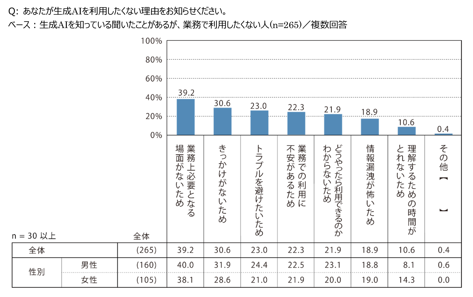 ■業務で生成AIを利用したくない理由「業務上必要となる場面がないため」39.2%、「きっかけがないため」30.6%、「トラブルを避けたいため」23%。