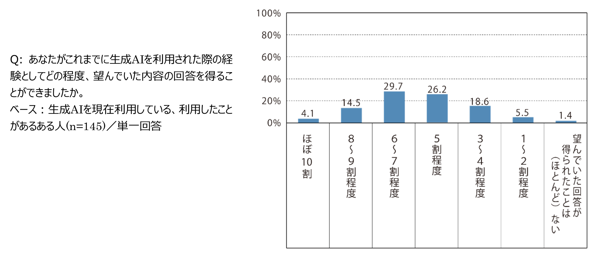 生成AIの利用者、利用経験者に生成AIで望んでいた回答がどの程度得られたかを尋ねたところ、最も多かったのは「6~7割程度」で29.7%、全体で「5割程度以上」と回答したのは74.5%となりました。