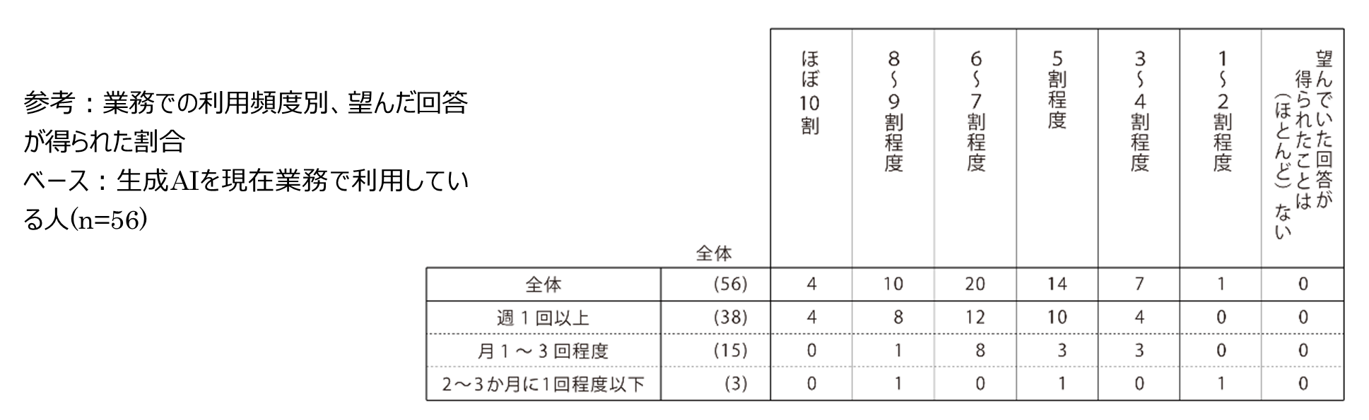 また、以下はサンプル数が少ないため参考値となりますが、望んだ回答が高い割合で得られた人は、週1回以上の生成AI利用者が多くなっています。利用頻度が多いことで、扱いにも詳しくなり、生成AIをうまく活用できている様子が推察されます。